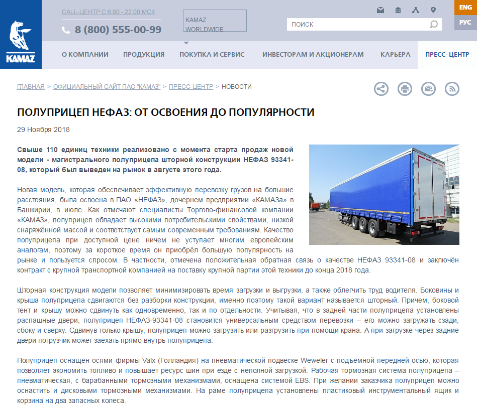 作為側(cè)簾半掛車的新車型,NEFAZ 93341-08自從今年8月份推出市場以來,累計銷量已經(jīng)超過110臺。