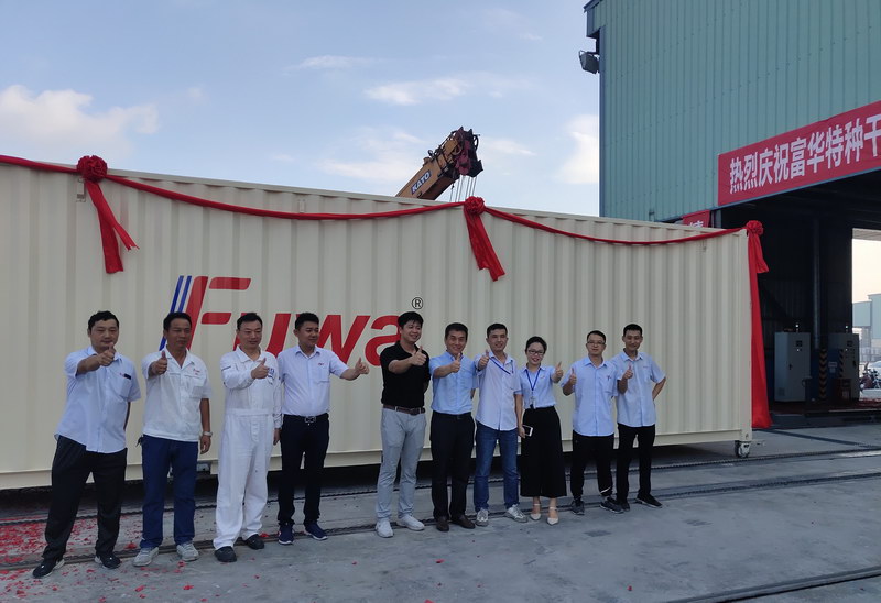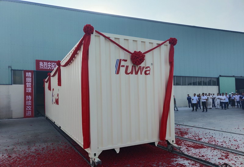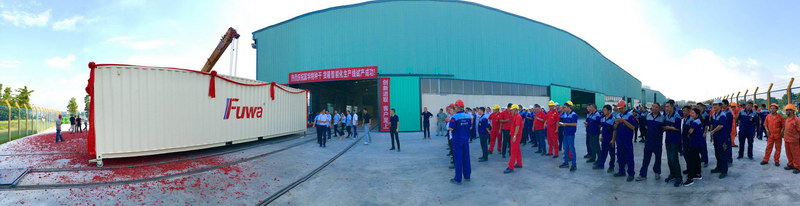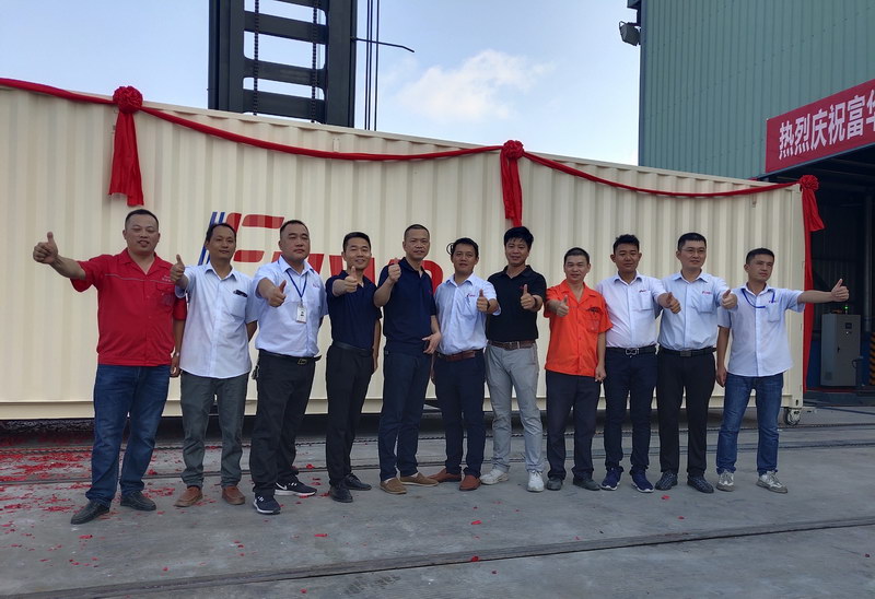 2019年6月28日,富華特種干貨箱生產(chǎn)線第一臺(tái)集裝箱在富華人充滿期待和欣喜的目光中,披著喜慶的紅綢絹花,宛如出閣的大家閨秀,款款而出,此刻的她,光芒四射!